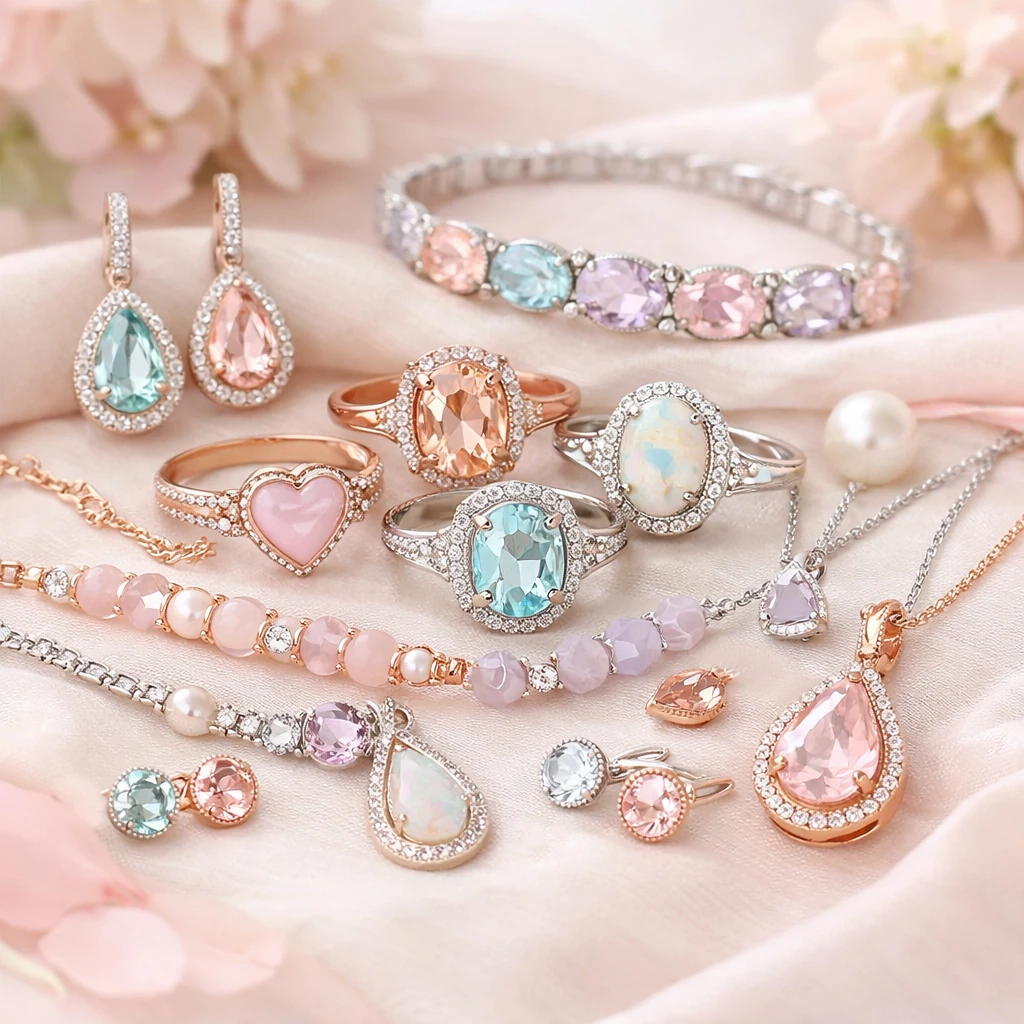 - رنگ سنگها: آبی روشن، بنفش یاسی، صورتی ملایم، زمردی