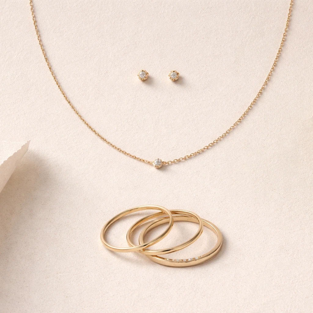 - گوشوارههای میخی کوچک، گردنبند ظریف، یک یا دو انگشتر ساده.