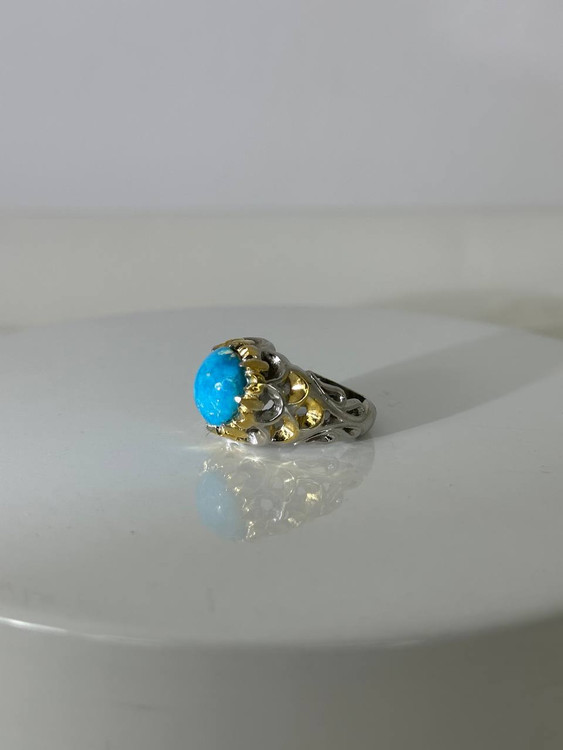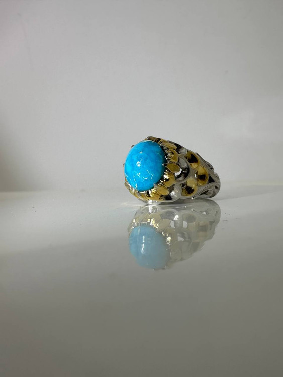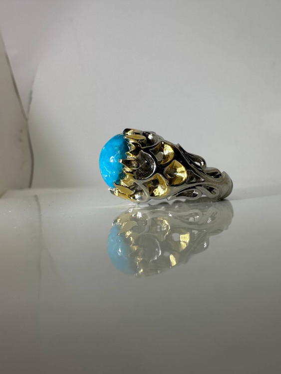 سنگ طبیعی فیروزه نیشابوری عجمی.این انگشتر هنری فاخر و ارزشمند و دست ساز که در آن از تکنیک ها و سبک های مختلفه این هنر استفاده شده است.آب طلا و آب رادیوم کاری شده.
