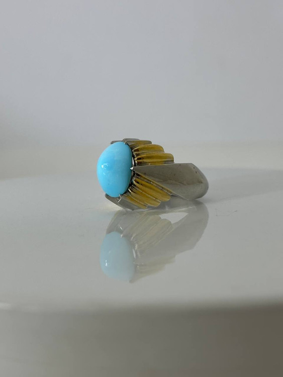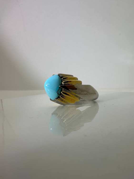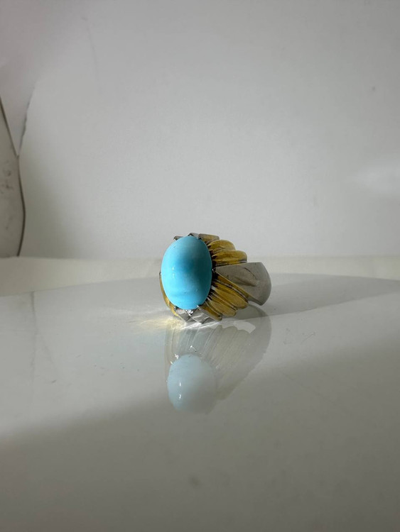 سنگ طبیعی فیروزه نیشابوری عجمی.این انگشتر هنری فاخر و ارزشمند و دست ساز که در آن از تکنیک ها و سبک های مختلفه این هنر استفاده شده است.آب طلا و آب رادیوم کاری شده.