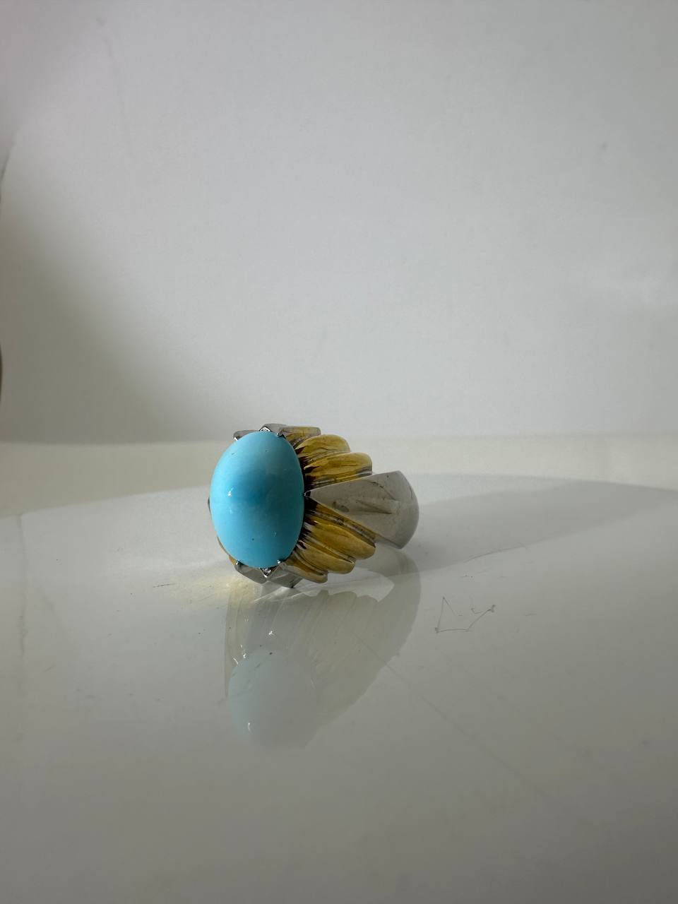 سنگ طبیعی فیروزه نیشابوری عجمی.این انگشتر هنری فاخر و ارزشمند و دست ساز که در آن از تکنیک ها و سبک های مختلفه این هنر استفاده شده است.آب طلا و آب رادیوم کاری شده.