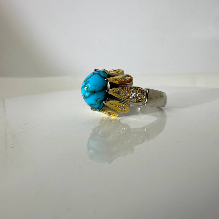 سنگ طبیعی فیروزه نیشابوری عجمی.این انگشتر هنری فاخر و ارزشمند و دست ساز که در آن از تکنیک ها و سبک های مختلفه این هنر استفاده شده است.آب طلا و آب رادیوم کاری شده.این انگشتر مخراج کاری شده