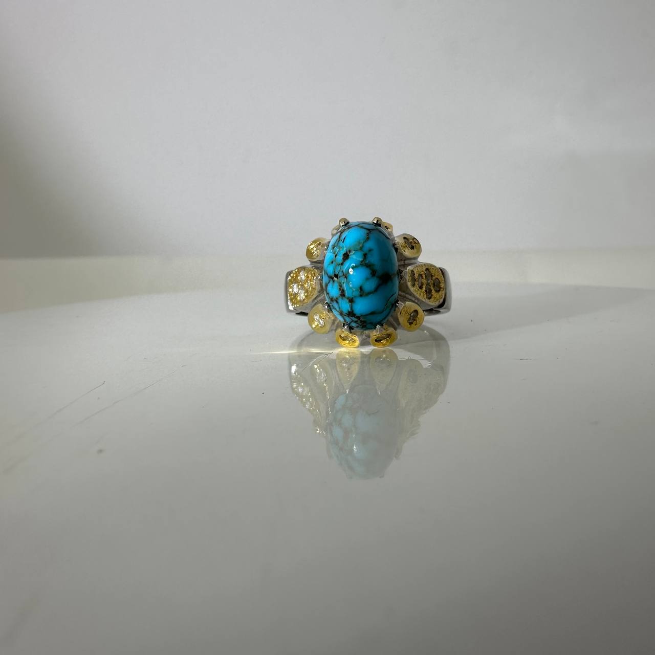 سنگ طبیعی فیروزه نیشابوری عجمی.این انگشتر هنری فاخر و ارزشمند و دست ساز که در آن از تکنیک ها و سبک های مختلفه این هنر استفاده شده است.آب طلا و آب رادیوم کاری شده.این انگشتر مخراج کاری شده