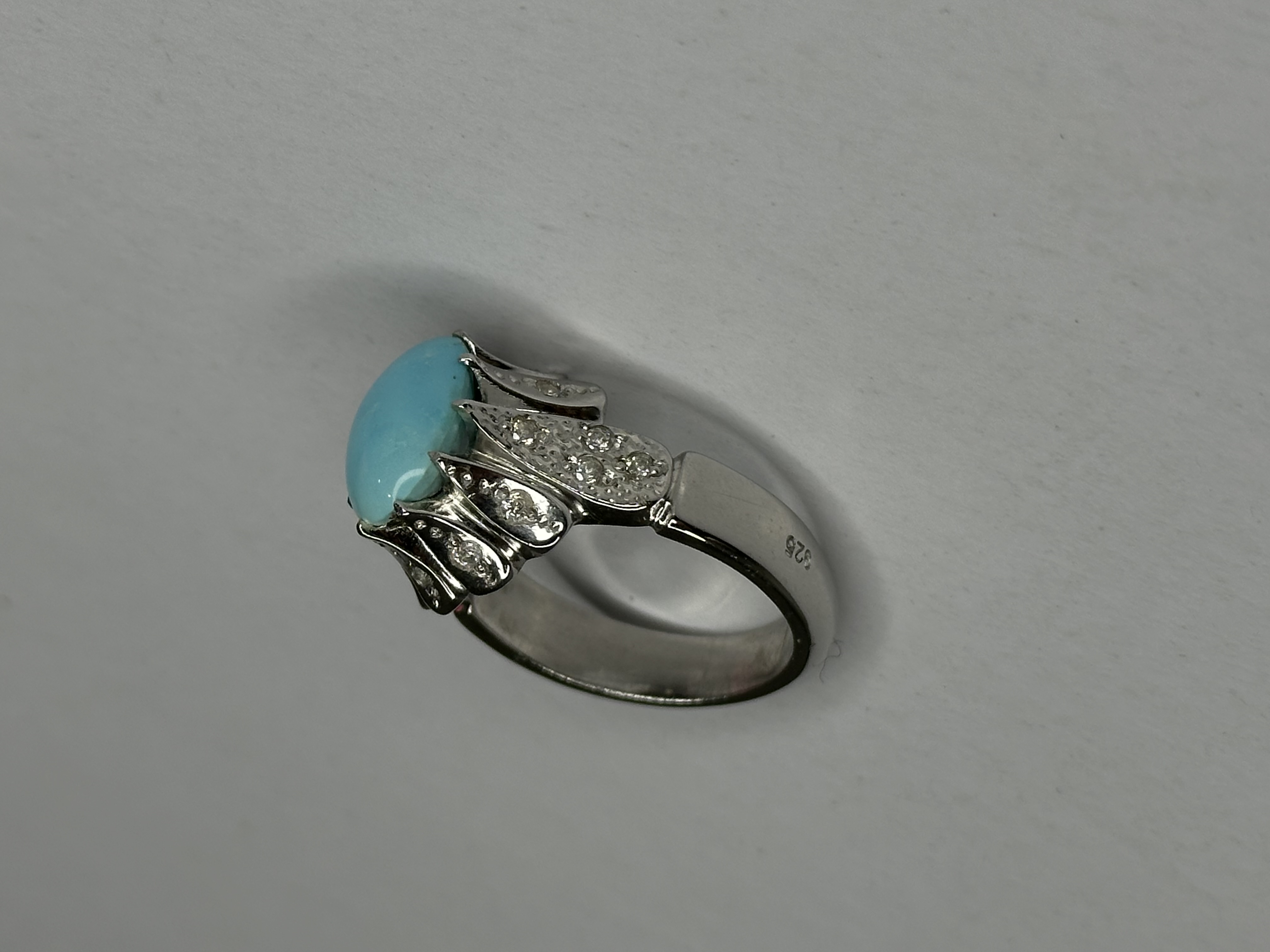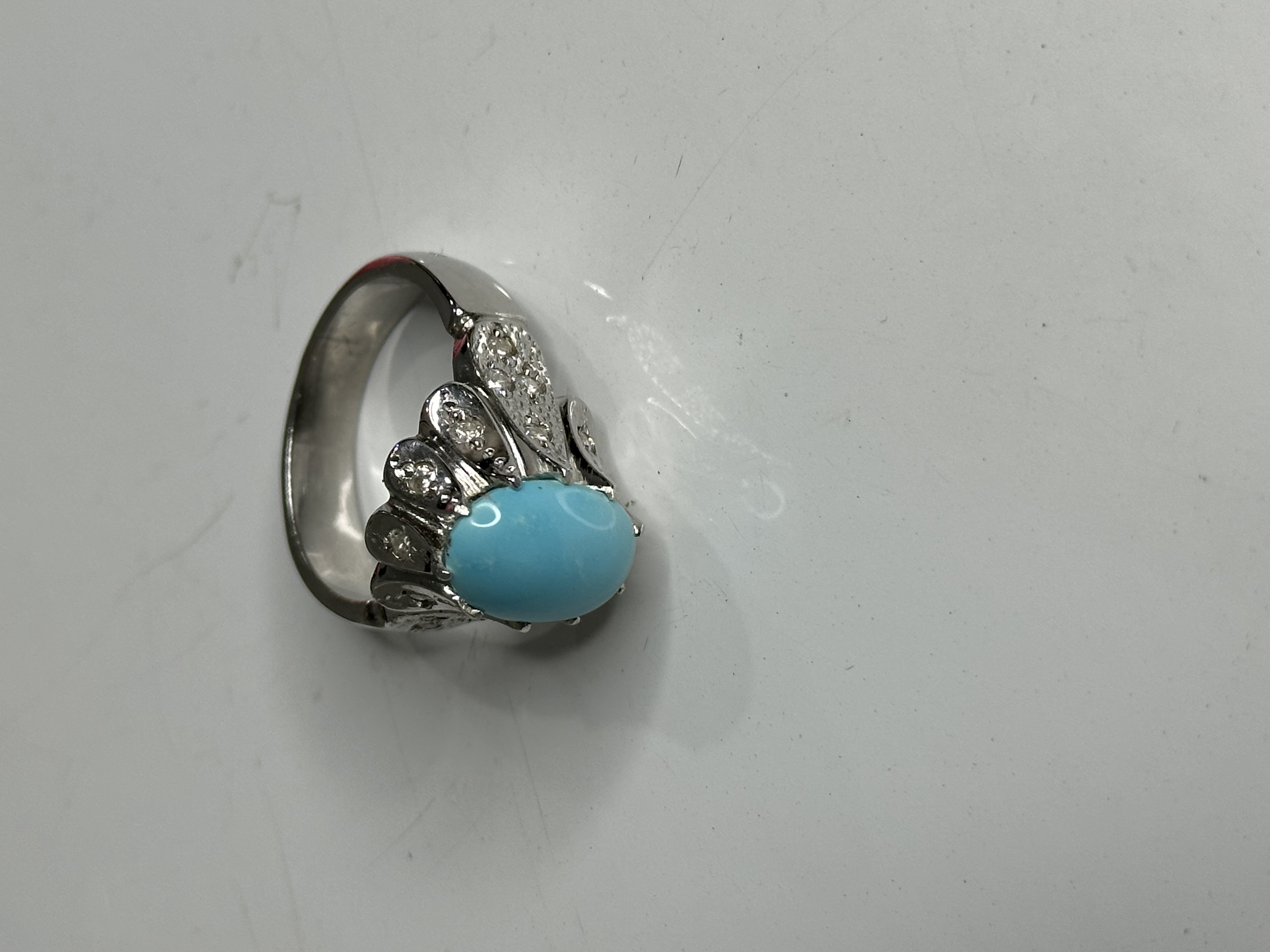 تحلیل سنگ: سنگ قرار گرفته روی این رکاب، یک نمونه شاخص از فیروزه پاک (بدون شجر) با تراش بیضی دامله است. توزیع رنگ در تمام سطح سنگ کاملاً یکنواخت بوده و هیچگونه ناخالصی یا ماتریکس (رگه) در سطح دیده نمیشود که آن را در رده فیروزههای درجه یک قرار میدهد.