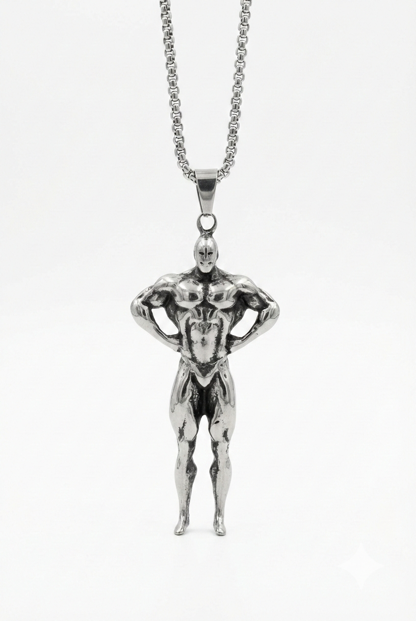 این گردنبند نمایشگر یکی از نمادینترین فیگورهای دنیای بدنسازی است که جزئیات عضلات چهارسر ران، شکم و زیربغل در آن با دقت خیرهکنندهای طراحی شده است. انتخابی هوشمندانه برای کسانی که به زیباییشناسی عضلات و استایل کلاسیک بدنسازی علاقه دارند.