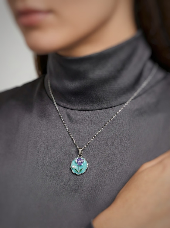 گردنبند پینترستی میناکاری تک مروارید با گل بنفش